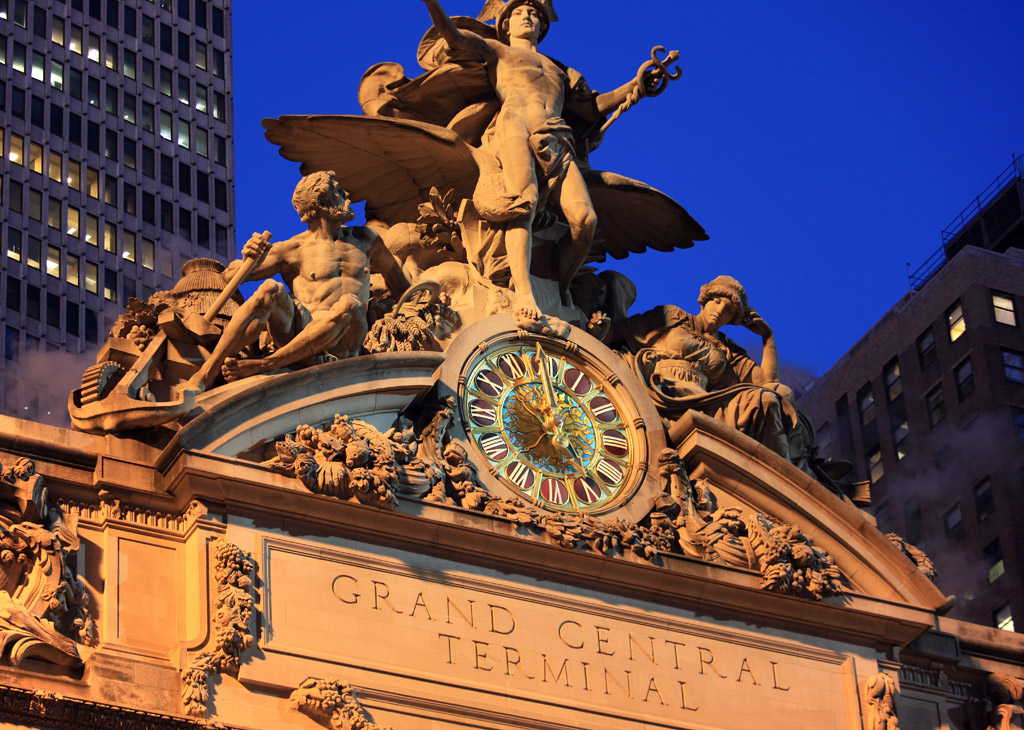 Everything about the terminal is massive, starting from the entrance on 42nd Street. A 13-foot-wide clock, bedecked with the world’s largest display of Tiffany glass is surrounded by a stunning 48-foot-high limestone sculpture of three mythological figures, Minerva, Mercury and Hercules.